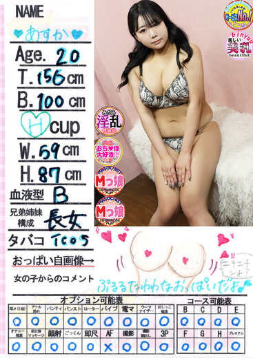 ドMでエッチが大好きな「あすか」ちゃんの嬉しい乳店です!!ルックスはロリかわいい系で幼い清楚系♪性格は愛嬌良く、誰とでも仲良くなれそうな女の子です!おっぱいは形良く、綺麗なまんまるHカップ♪「エッチなことはなんでもしてほしいです・・//」と超がつくドMっぷりで責めごたえ超抜群!すぐイってしまう敏感体質でまさかの乳首だけで鬼イキ!?プレイに入ったエロ具合にはお客様も大興奮必至!性欲が果てるまでプレイしちゃってください!OPはほぼオールOKの変態ちゃんです!また会いたい、またいじめたいそう思うことは間違いありません!是非「あすか」ちゃんとえちえちなお時間をお過ごし下さいm(_ _)m