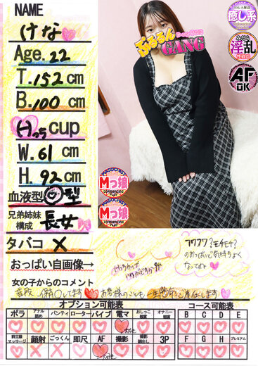 お尻が超性感帯の「けな」ちゃんの嬉しい乳店です♪ルックスは幼さ残る清楚系!よく笑う愛嬌満点の明るい女の子です!おっぱいはボリュームたっぷりHカップ!ドMで責められることが大好きで特にAFが好きとのことで貴重な存在で責め好き、AF好きのお客様はかなり満足いただけることは間違い無し!「もう1回してください・・//」と「けな」ちゃんから求めてくることも多いと思いますがお客様の性欲が果てるまでハッスルしちゃってください!是非「けな」ちゃんと楽しいお遊びをお楽しみくださいm(__)m 【デリバリー】○ 【自宅】○ 【アレルギー】無 |