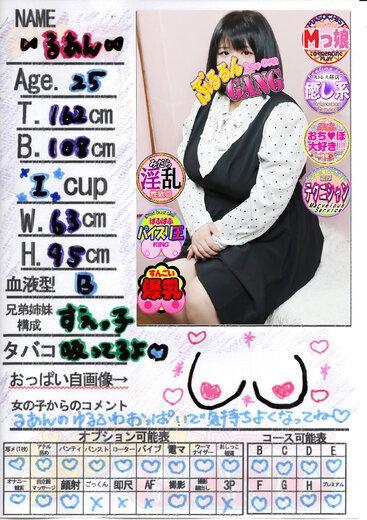 | 思わず視線を奪われる、規格外のIカップを揺らして現れた彼女。『るあんさん』圧巻の入店!!!包みこまれる笑顔とM気質の甘い空気感。その迫力とは裏腹に性格はとことん従順で甘えたがりな性格の持ち主。虐められると嬉しそうに照れてしまう姿、そして心と身体の距離が近づく程、乱れに乱れ狂います。「こんな反応されたら、もう止まらない」そう思わせる危険な魅力がある彼女です。また高いサービス精神もお持ちなので気持ちよくなってもらうことにも全力ですのでご安心下さい。 特に責めるのがお好きな方は彼女の素直すぎる反応を是非とも独り占めしてください! 【デリバリー】○ 【自宅】○ 【アレルギー】なし |