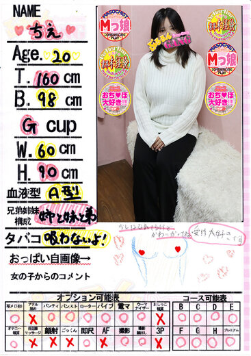 | ちえ(20歳) T160 B98(G) W60 H90 |