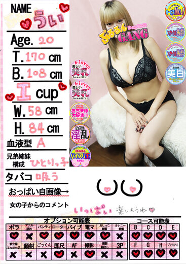 | うい(20歳) T170 B108(I) W58 H84 |