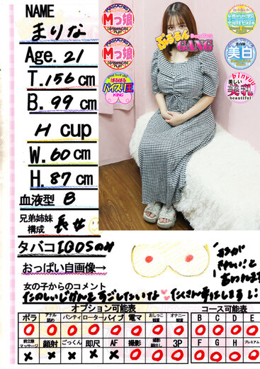 | まりな(21歳) T156 B99(H) W60 H87 |