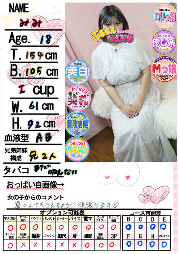 | みみ(18歳) T154 B105(I) W61 H92 |