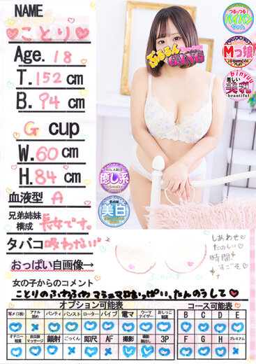 犯罪臭がしちゃうロリかわ巨乳『ことり』ちゃん乳店です♪♪ロリ巨乳好き必見!!夜出歩くだけで補導されちゃう学生にしか見えない幼いルックス!でも服の下にはぷるっぷるのえっろいGカップおっぱいが隠れています!顔に似合わずちょっとおっきめの乳輪がおっぱい好きの琴線を刺激します♪♪キスが大好きなのでキスしているとつるつる合法ロリま〇こがぬるぬるになっちゃいます!お〇んこの中もクリちゃんも敏感なのでどっちでもイケちゃいます!一回だけだと満足出来なくて何度もおねだりしちゃうかも!?素人感も抜群なのでロリ素人好きな方はぜひお遊びいただければと思います♪ 【デリバリー】○ 【自宅】〇 【アレルギー】無 |