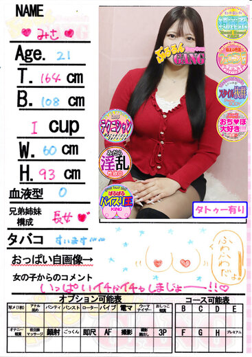 | みさ(21歳) T164 B108(I) W60 H93 |
