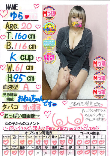 | ゆら(20歳) T160 B116(K) W61 H95 |