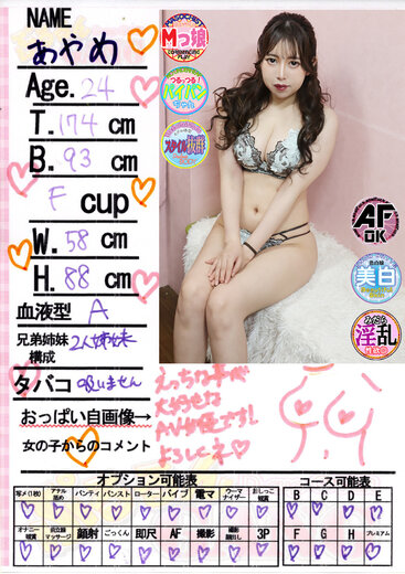 現役AV女優として活躍中のあやめちゃん入店致しました!!まさに本物のプロフェッショナルがここに降臨です。ひと目見た瞬間、その174pの高身長でスラリとした美しいスタイルに誰もが圧倒されることでしょう。しかも、彼女は全てのオプションに対応可能。お客様のどんなご要望にも120%お応えすることをお約束します。あやめちゃんの魅力は外見だけに留まりません。エロさが全身から溢れ出し、ほんの少し目が合うだけでムラムラが止まりません。サービスはご奉仕型のドM。お客様のためならどんなことでも全力で尽くしますので、普段はなかなか味わえない非日常の快感を存分にお楽しみいただけます!!現役AV女優ならではのテクニックと、徹底したご奉仕精神、そして天性のエロさ。すべてを兼ね備えたあやめちゃんと過ごす時間は、まさに夢のようなひとときです。未体験の快楽を、ぜひ一度ご堪能ください。ご予約はお早めに!