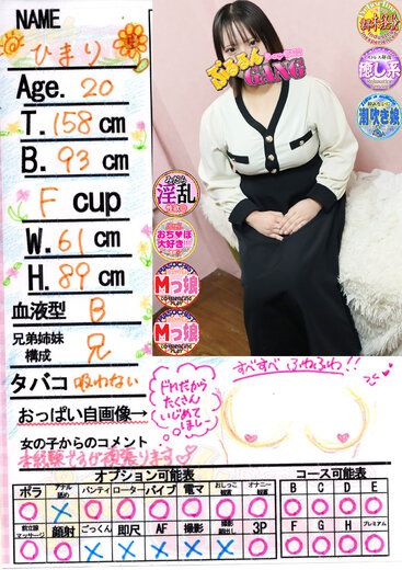 ☆★完全業界未経験★☆超ドMでめちゃくちゃにして欲しい「ひまり」ちゃんの嬉しい乳店です♪ルックスは妹カワイイ系!性格は未経験らしく、愛嬌満天!おっぱいは小ぶりながらしっかりFカップ!男性経験もあまり多くなく、まだまだ男を知らない純白ボディ//でもたくさんいじめられたい願望があり、中を責められるとイキながらの潮吹き確定!エッチな事はなんでも大好きで、思いっきりめちゃくちゃにして欲しい超ドM!未経験ながらもポテンシャルは相当な物を感じます!「めちゃくちゃにされて興奮しちゃいます・・//」思いっきり女の子をいじめたいお客様は超楽しめることをお約束致します!是非「ひまり」ちゃんと楽しいお遊びをお楽しみ下さいm(_ _)m