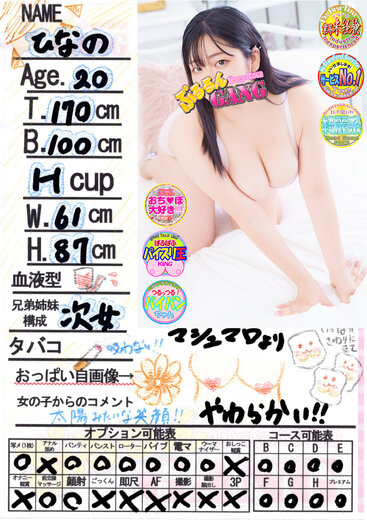 ☆★完全業界未経験☆★未経験めちゃイキ少女【ひなのちゃん】入店です!!真ん丸プリンプリンの軟乳Hカップで全身性感帯の【ひなのちゃん】。毎日5回逝くまでオナニーすることが日課で耳を責められるだけで逝っちゃうという何とも繊細で可愛い女の子!!とっても礼儀正しく明るい性格で男の人とイチャイチャするのも大好き!!リードされるのが大好きなのでしてくれた方にはネトネト系の奥までフェラでお礼をしたいそうです!!ピュアなのに性欲旺盛な敏感美少女【ひなのちゃん】!!めっちゃ大きい声で喘ぐので※要注意です!!早めのご予約お待ちしています!!