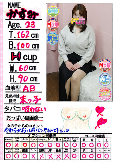 容姿端麗女子アナ系の生粋のドM美女!!!初対面でも「もっと舐めて」「もっといじめて」と、まるでご主人様への忠誠を誓うかのような瞳で見つめてきます。その一途な姿勢に、つい心も体も熱くなってしまうお客様が続出間違いナシ!!!きめ細やかで吸い付くような美肌は、触れた瞬間に誰もが虜になるはず。かすみちゃんの最大の魅力は、いじめればイジメた分だけ、何回でも果ててしまうその敏感さ。お客様の手や舌に素直に反応し、声を押し殺しながら快感に身を任せる様子は、まさに絶景としか言いようがありません。どんなプレイも恥ずかしがりながらも一生懸命応えてくれますので、Sな方にはたまらない逸材。かすみちゃんの限界をぜひ、あなたの手で探ってみてください。忘れられない夜を保証いたします。女子アナをめちゃくちゃにしている感覚でお遊びできますよ♪