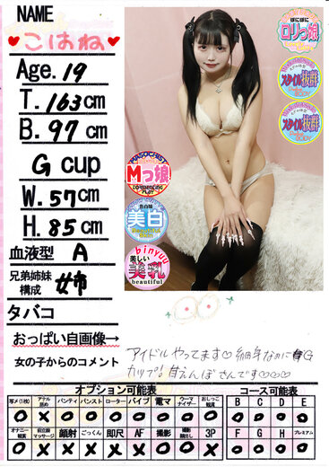 現役ガチアイドル!!歌って踊れてエッチも得意!?『こはね』ちゃんの乳店です!!ベッドの上であなただけへのファンサービス!!現役のガチアイドルがパイズリしてくれちゃいます!!スタイルは華奢で強く抱きしめたら壊れてしまいそうな繊細ボディ!!こんなにも細いのにGカップのバストで超美乳です♪幼いロリ系のTHEアイドルフェイス!!性格も小悪魔系の甘えん坊♪中身まで可愛すぎます!!そしてお話しているだけでも雰囲気からわかるくらい性欲がかなり強くエッチが好き!!甘えながらイチャイチャしながらステージでは見せれないあられもない姿を晒してくれます♪全身を舐めつくしてしまいたいほど若い美肌!!感度も良すぎてくねるように悶える姿にお客様の下半身のペンライトはこはねカラーに染まってしまいます!!アイドルの本気のイキが見れたらもうファン確定♪是非推してあげてください!!