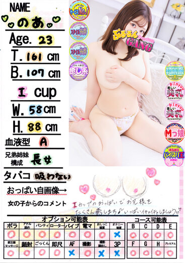 日本中の巨乳好きの皆様へ超ビッグニュース!!某巨乳店の不動の1が奇跡の電撃乳店!多くは語らなくても存在自体が神に等しいそんな女の子です!巨乳好きの方なら誰もが一度は入っておかなきゃならない女の子です!美乳レベルも当店トップクラス!ルックス抜群!愛嬌もかなり良く誰もが好きになってしまうことは間違いありません!一度ではなく何度もすぐに会いたいと思うような「のあ」ちゃんの中毒性は彼女ならではの最大の魅力です!性格はかなり優しい性格なのでリードしてくれるお客様大募集!敏感の乳首は責めれば責めるだけ濡れてしまう感度抜群BODY!国宝級のおっぱいでパイズリされれば視覚だけでも超興奮できることは間違いありません!皆様の記憶に残るサービスをお約束致しますm(__)m是非「のあ」ちゃんと人生で最高の体験をお楽しみくださいm(__)m