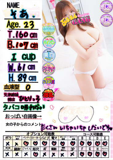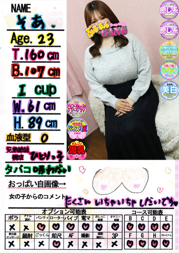 ほんわか雰囲気で心の芯からアナタを癒す「そあ」ちゃんの嬉しい乳店です♪ルックスはたれ目で顔から優しさが滲み出てる可愛らしい女の子です!性格はとにかくほんわか癒し系!身体も癒されて心も癒されて最高の気分になることは間違いありません!!おっぱいは柔らかそうなふにゃふにゃIカップ!揉みごたえは超抜群です♪パイズリが大好きで挟まれるだけでイキそうになっても「まだダメー//」と小悪魔的なところも中毒性抜群!パイパンのドエロ素股も期待大です!「そあ」ちゃんと癒しとエロの空間を是非お楽しみくださいm(__)m