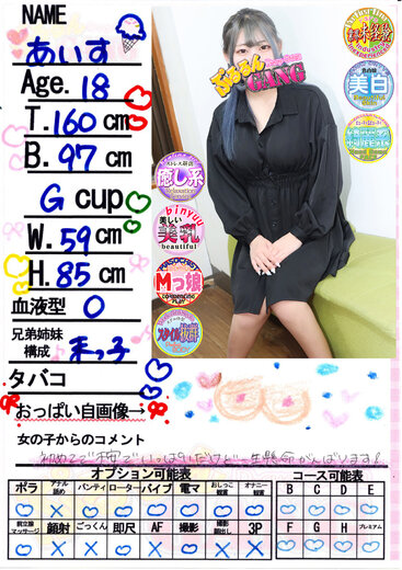 ☆★完全業界未経験★☆ドМの未経験Gカップ「あいす」ちゃんの乳店です♪体つきを見てその締まったウエストと綺麗なおっぱい、未経験の女の子でこんな体つき本当に来てくれてありがとうと言ってしまいました!!!Gカップの美乳は巨乳と可愛さを求める男性にもオススメ出来ます!!!愛嬌満天、未経験なりに話を吸収しようとする姿をみてこんないい子なかなかいないぞと確信してしまいます♪18歳の初々しさからは想像もできないカワイイ喘ぎ声、是非聞きに来てください♪何にも知らない発展途中のあいすちゃんを紳士に責めて是非色々教えてあげちゃってください♪こんな子と遊べるのもここぷるるんギャングしかありません!!!宜しくお願い致します!!!