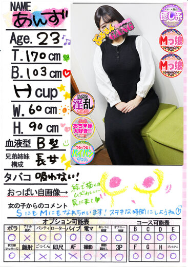 高身長×とびきり元気なドスケベ素人♪『あんず』ちゃん乳店です♪♪ちょっとおっきめな乳輪がエロエロなHカップふわふわ巨乳♪人当たりもよく丁寧で性格の良さが滲み出ている『あんず』ちゃん♪ぺろぺろされると声が我慢できなくなっちゃう敏感乳首も必見です♪クリちゃんが特に敏感だそうなのでふやけるくらいいっぱいしゃぶっちゃってください♪クリちゃんをペロペロされるとエッチなお汁が洪水の様に溢れちゃいます!クリイキしまくって暴走エロモードになった『あんず』ちゃんはだれにも止められません!ひとりエッチもたまにするそうですが、お客様とのイチャイチャエッチの方がストレス解消にはいいみたいです(;^_^A