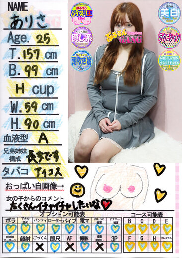 絶世のH乳ハーフ美女【ありさちゃん】入店です!!ぱっちりお目目のキレカワ美少女のありさちゃん!!ハーフならではの色素の薄い真っ白な美肌に綺麗で可愛いお顔は勿論、Hカップの美巨乳も形、色、質感も全てが完璧!!どちらかというと男の人を責めたいありさちゃんは自分だけじゃなく男性の潮吹きもさせちゃうくらい責め上手!!とっても丁寧に責めますので初めての方でも安心してお遊びできます!!おもちゃも大好きで潮も吹いちゃいますのでデンマやウーマを付けてのお遊びをおススメします!!ねっとりマットプレイも大好きなのでホットローションコースつけても楽しいかも!!