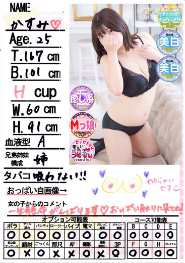 柔らかそうな純白おっぱい♪肌キレイな美乳素人「かすみ」ちゃんが乳店しました♪綺麗な黒髪ストレートと清楚系な見た目ですが性格は明るく雰囲気も話した感じも「夜職感」や「お仕事感」をまったく感じさせない自然体な女の子です♪落ち着きがあっておっとりした性格と優しさに誰もが癒され、微笑みにはつられてこちらまでも笑顔になる様な魅力を秘めております♪プレイが始まれば急にスイッチが入ったようにエッチなオンナへと変貌し、ベッドインからお別れするまで彼女の魅力を思う存分楽しめます!!そんな最高な美おっぱいを是非ご堪能くださいませ♪