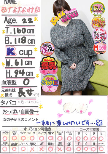 ☆★完全業界未経験★☆とっても純粋で朗らかな笑顔、ドキッとする表情や仕草に一目ぼれ!!!キュンキュン娘「ななみ」ちゃん乳店です!見るだけでも圧巻!!待望の業界未経験のKカップはインパクト絶大♪♪思いやりがあり優しく親しみのある彼女はHな事がとっっても大好き(^^)/おっぱい写真を撮るだけで赤面する彼女の性感帯はもちろん胸とクリちゃん。優しく愛撫されれば震える体と声がなんともエロい!もちろんヌレヌレ具合は凄いとお話しております( *´艸`)ささやき声だけでドキドキと胸の鼓動が高鳴りドエロい雰囲気に乱れます。ご奉仕するのも好きみたいで、優しく丁寧なフェラはお兄さまもそうですが自分自身も興奮しちゃうみたいです!恥ずかしがり屋でスーパー癒し系の彼女とHな楽しみを身体全身で体感してみてはいかがでしょうか??正真正銘初めてなので優しくご対応お願いします。
