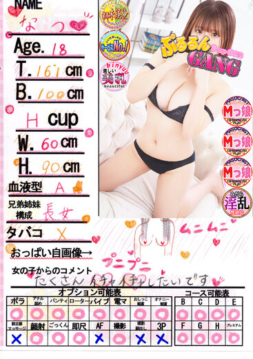 ☆★完全業界未経験★☆男性経験極少!!潮吹き確率100%超え!!激アツな18歳未経験の「なつ」ちゃんの超嬉しい乳店です♪ルックスは幼さ残る激カワイイ系♪おっぱいはまだあまり触れられたことがない真っ白なHカップ!!性格も非常に良く、明るく何にも染まっていない純粋な感じはこの業界ではなかなか出会えないプレミアチケット!!ドMでエッチな事はなんでも大好きなダイヤモンド級の原石です!!超特異体質!!妄想で潮吹きしちゃうんです!布団が水溜りなんてレベルじゃなく、壁や天井まで届く潮吹き飛距離はマジでギネス級!「毎日下着は10枚以上変えてます…\\」と自身はコンプレックスに感じている体質ですが、潮吹き好きのお客様には絶対に体感して欲しいこの体験!日本で1番の潮吹き体験ができることでしょう!超超超ドMなのでエッチな事はなんでもして欲しいとのことですので責め好きなお客様は一度は入って頂きたい期待の女の子となっております♪是非是非「なつ」ちゃんと日本1の体験を是非お楽しみくださいm(__)m非常にオススメな女の子です!