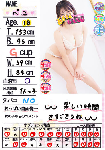 自分で認めちゃうくらいドMの責められるのが何よりも大好きな「ぺこ」ちゃんの嬉しい乳店です♪ルックスはまだ幼さ残る妹ロリ系♪おっぱいはツンと上向きの10代特有のハリがあるおっぱい!今年の3月まで高校生だった女の子に触れる機会はまずありません!しかもエッチ大好きで、超絶のドMで「喘ぎ声も大きくてドMでお客様に嫌われないですかね・・」と経験の浅さから責められることが悪い事みたいに感じちゃってるみたいですが、我慢できないくらい性欲の旺盛さ!中を責められると鬼の連続イキ!責めてこれほど楽しい女の子もなかなかいないかと思います!ぜひぜひお客様の鬼責めで満足させてあげてください♪楽しいお遊びをお楽しみ下さいm(__)m