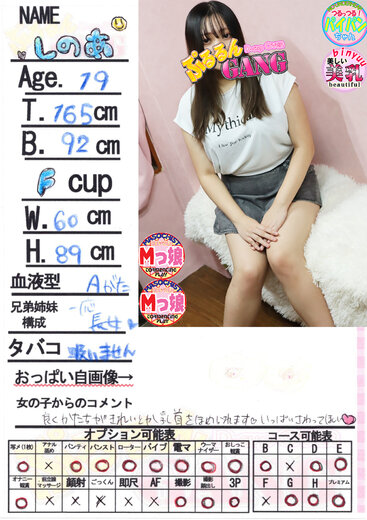 至福の美少女『しのあ』ちゃんの乳店です(^^)/男性から見れば、その瞬間にイジメたくなるようなBODYには生唾もの間違いなし感度も良好で、性感帯のアソコを少し舐められただけでもえっちなジュースが湯水のように溢れ出てきちゃうそうです☆彡ムラムラすると我慢できずに1人で夜な夜な自分を慰めてしまうほどに性欲の強い『しのあ』ちゃんは、おもちゃが大好物(^^)/特にバイブで責められると声を押し殺しながらもびくびくと全身を痙攣させながら絶頂に達してしまうくらいの欲しがりさん//アブノーマルなことにも興味津々な『しのあ』ちゃん♪責め好きのお客様にはピッタリの変態美少女『しのあ』ちゃんのご予約ご指名お待ちしております(^^)/