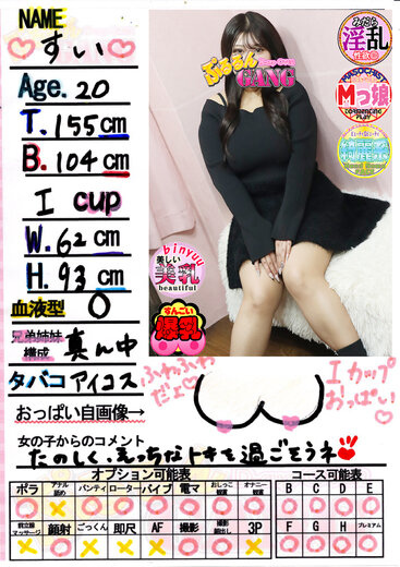 明るく可愛くそしてビンカン!!最高のエロ体験「すいちゃん」の乳店です♪黒髪が美しい明るく元気なすいちゃん♪エロい事したいなら絶対この子!!見るからにエロい豊満なおっぱいはパンパンに詰まったIカップ!!触ってみたらもっとエロイ!!というもうエロい事するために創造された、と言っても過言じゃないエロ特化ボディをしてます♪乳首はビンカンすぎて指で乳首をイヤラシタップで責めてあげればアソコから汁が出放題!!大好物の電マなんて使おうものなら何度もイキっぱなし!!お返しのパイズリは弾力抜群で性欲の尽きるまでお付き合いお願いします!!どうぞ、濃厚で楽しいお時間をお過ごしくださいませ!!