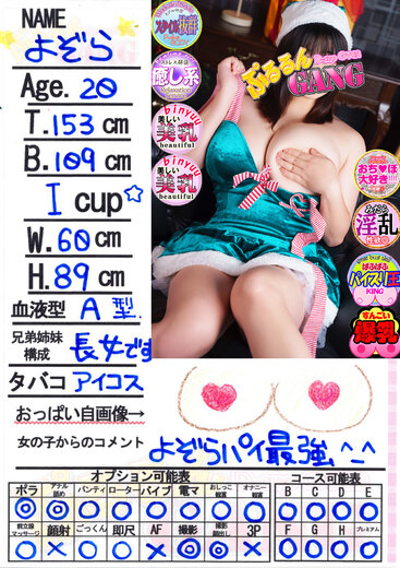 えちえちの実の能力者「よぞら」ちゃんの嬉しい乳店です!清楚なルックスなのに、人懐っこい癒し系です♪人懐っこくて思わず彼女にしたい!!とそんなことを思わせてくれるそんな女の子です♪美しいくびれからドドーンと見て美乳、パイ圧たっぷりのIカップでのパイズリは最高峰の楽しさです♪責められるのが大好きな「よぞら」ちゃん、自分でも認めるくらい感度良すぎて「喘ぎ声大きすぎて恥ずかしいです・・・//」と超敏感体質の感度に期待が高まるばかりです!乳首を責められてからの喘ぎ声はとにかく大きいみたいです♪エッチなことはとにかく大好きで、性欲旺盛なその姿に虜になってしまうお客様続出の予感が致します!!とにかくエロく、楽しい時間を過ごしたいアナタにオススメの「よぞら」ちゃんとの濃厚なお時間を是非お過ごしくださいませm(__)m