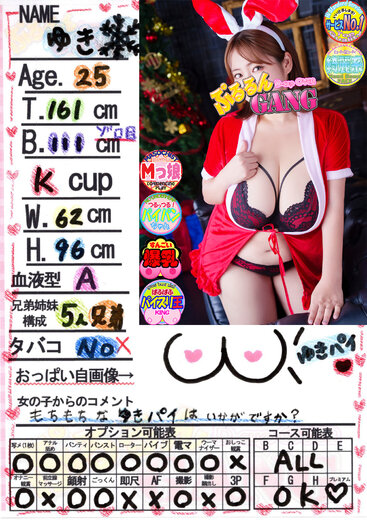 中毒性◎シルク肌K乳【ゆきちゃん】入店です!!沖縄出身とは思えない透き通ったシルクのような白い肌にこれぞ巨乳といったハリのあるタップンタップンの美しいKカップ、大人の魅力も兼ね揃えた美しいお顔に数々の殿方を魅了してきたテクニカルなパイズリとイチャイチャプレイ!!セールスポイントを書き出したらキリがない美女がぷるるんGANGに降臨しました!!得意のフェラは喉奥まで咥え込みエロい舌の動きで貴方を未知の体験へ導くこと間違い無し!!クリちゃんがとっても敏感で優しく責めちゃうとドエロムードにもブーストがかかっちゃいます!!是非、ご予約お待ちしています!!